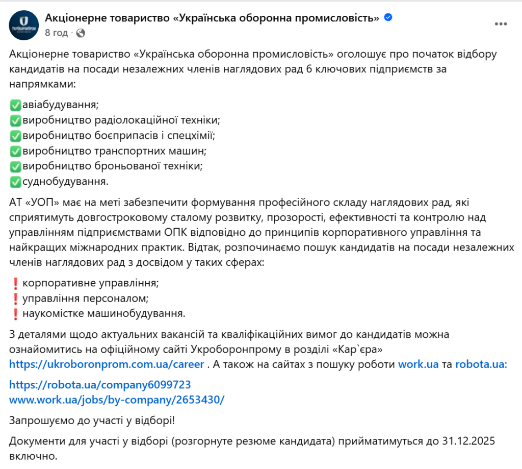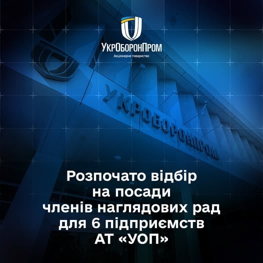 Акціонерне товариство “Українська оборонна промисловість” оголошує про початок відбору кандидатів на посади незалежних членів наглядових рад. Ідеться про шість ключових підприємств. Про це повідомили на Facebook-сторінці АТ “Українська оборонна промисловість”, інформує «Комерсант Український»