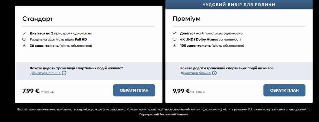 Додатково можна оформити пакет «Спорт» за €3 (≈145 грн) на місяць, який відкриває доступ до каналів Eurosport 1 та Eurosport 2.