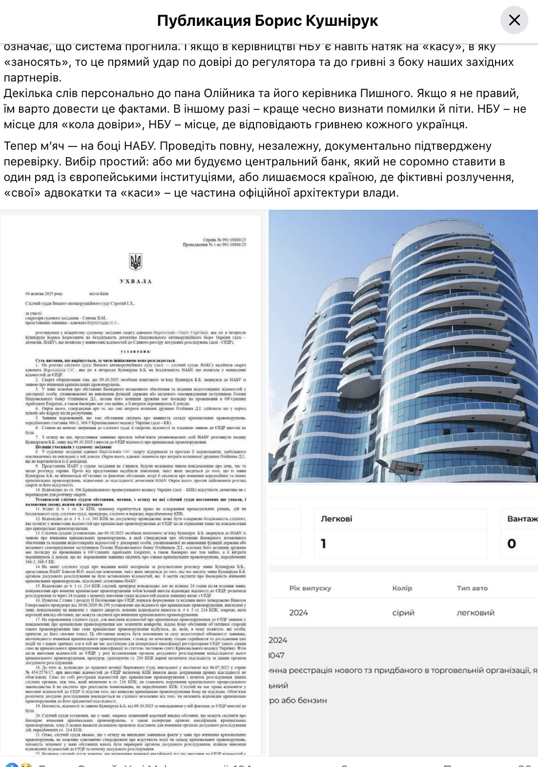 Крім того, за його даними, оренда помешкання в Дубай розпочалася 11 липня 2023 року, тоді як офіційне розлучення подружжя оформлене 28 грудня 2023-го. На думку автора, всі ці обставини, майно, доходи ексдружини, дійсний сімейний стан потребують перевірки з точки зору джерел походження коштів. Тим паче, що як припускає Кушнірук розлучення посадовця взагалі могло бути фіктивним.