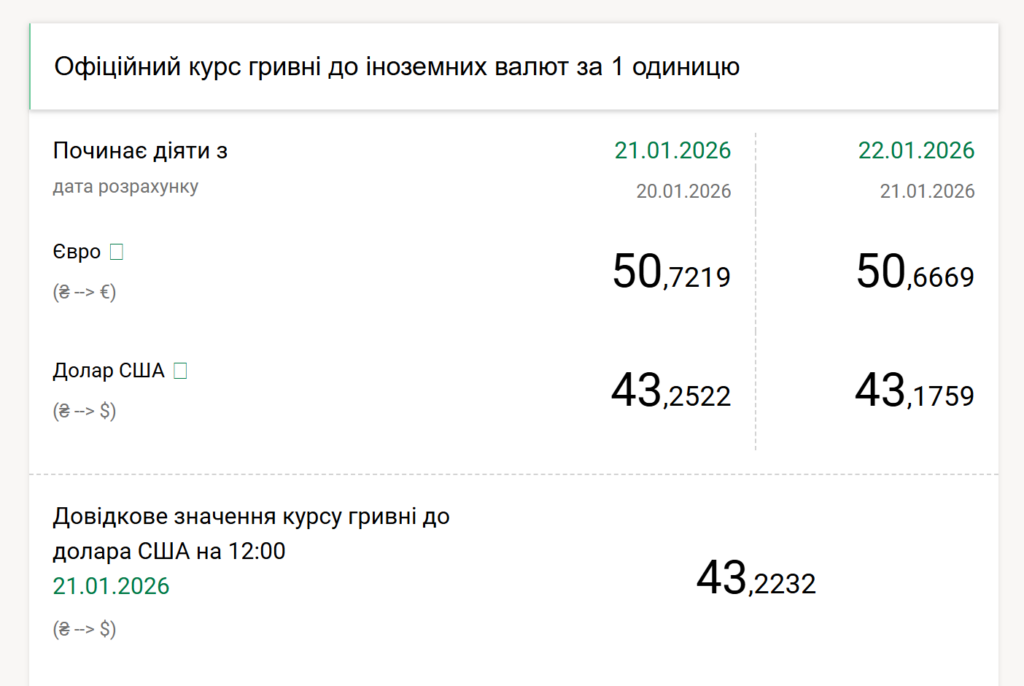 На четвер 22 січня Національний банк України встановив такі офіційні курси гривні до іноземних валют: