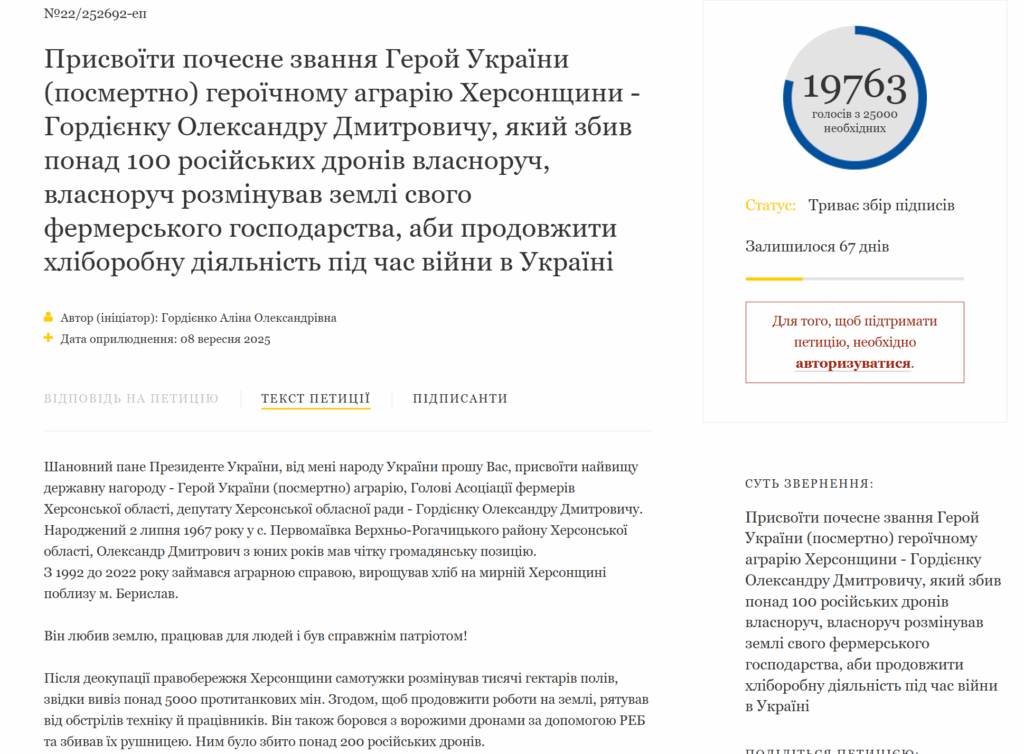 Донька загиблого фермера з Херсонщини Олександра Гордієнка — Аліна Гордієнко — ініціювала петицію до Президента України з проханням присвоїти її батькові звання Героя України (посмертно). Станом на сьогодні документ уже підписали понад 19 тисяч людей. Про це повідомляє «Комерсант Український» з посиланням на петицію.