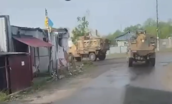 В українських Telegram-каналах з’явилося відео, як повідомляється, зі звільненої Курщини. На відео видно рух військової техніки постапокаліптичним ландшафтом. Над однією зі споруд, які проминає техніка, піднято український прапор.