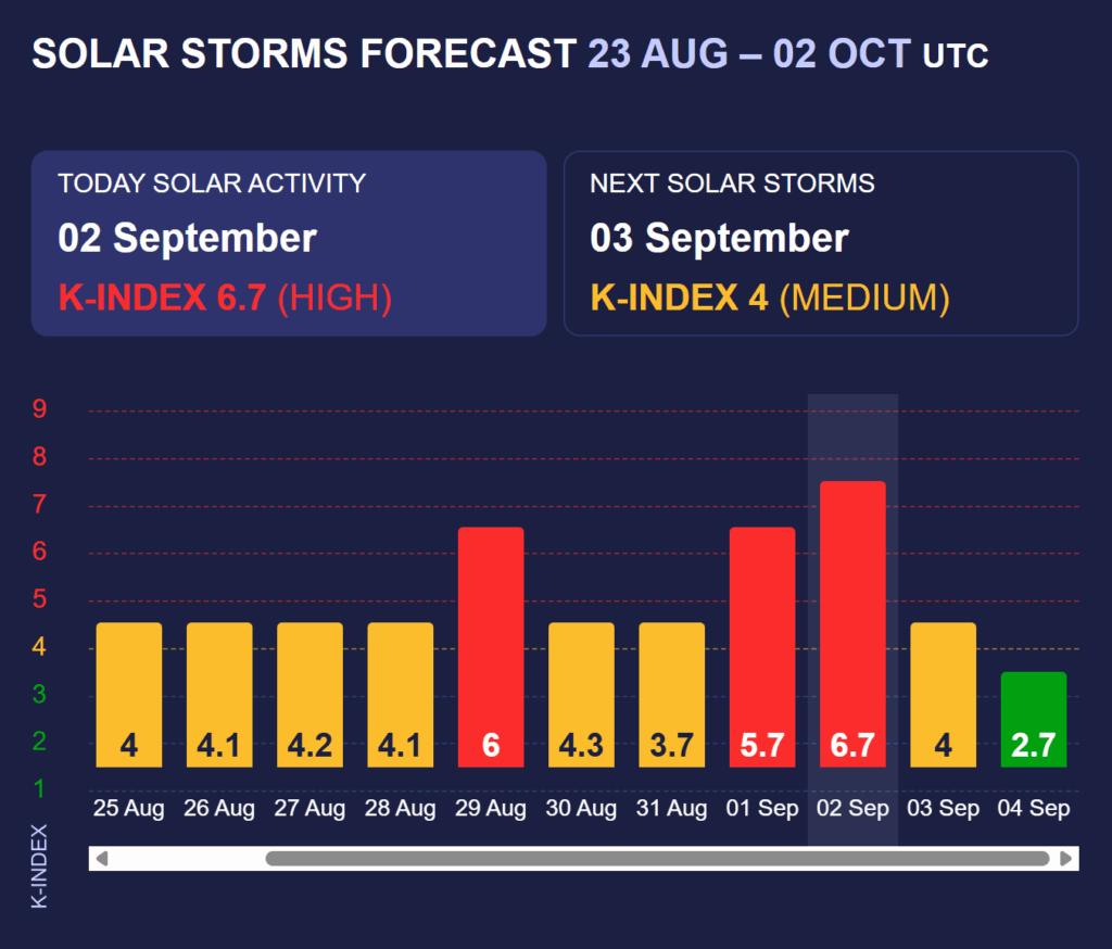 За даними фахівців, наразі сонячна активність становить К-індекс 6,7 (червоний рівень), що відповідає сильній магнітній бурі. Вона вважається досить сильною та впливає на самопочуття людей, викликаючи головний біль, апатію, тривогу та дратівливість.
