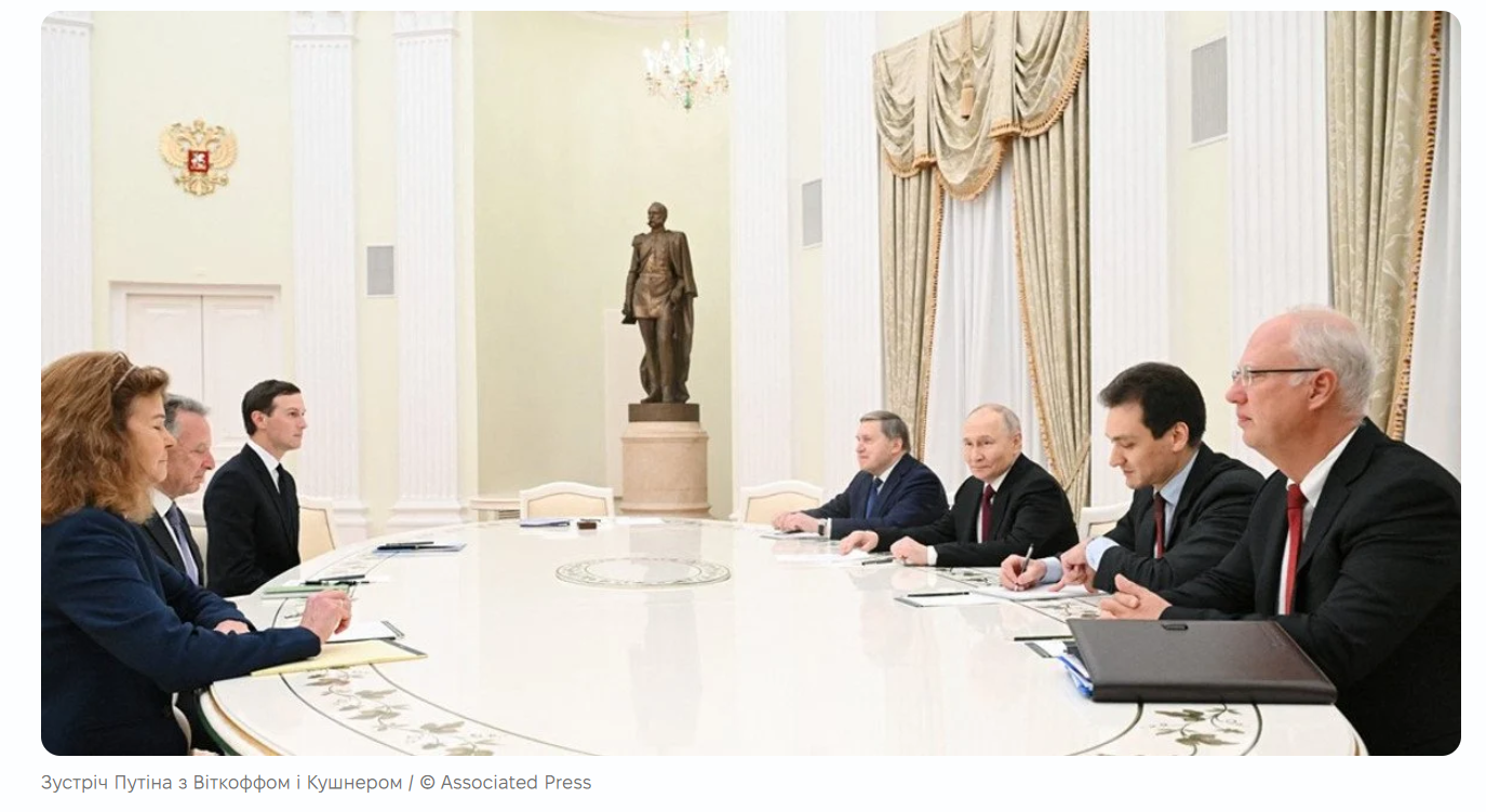 Переговори між диктатором РФ Володимиром Путіним та представниками США, серед яких були спеціальний посланник Стів Віткофф та зять Трампа Джаред Кушнер, тривали майже 5 годин.